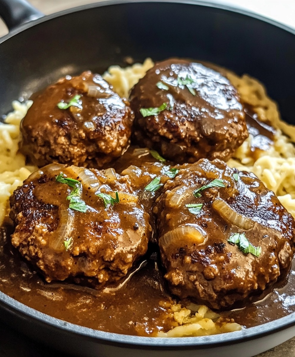 alisbury steak is a classic American comfort food made from ground beef patties simmered in a rich onion and mushroom gravy. This one-skillet meal is perfect for a cozy family dinner and pairs beautifully with mashed potatoes, steamed vegetables, or white rice.